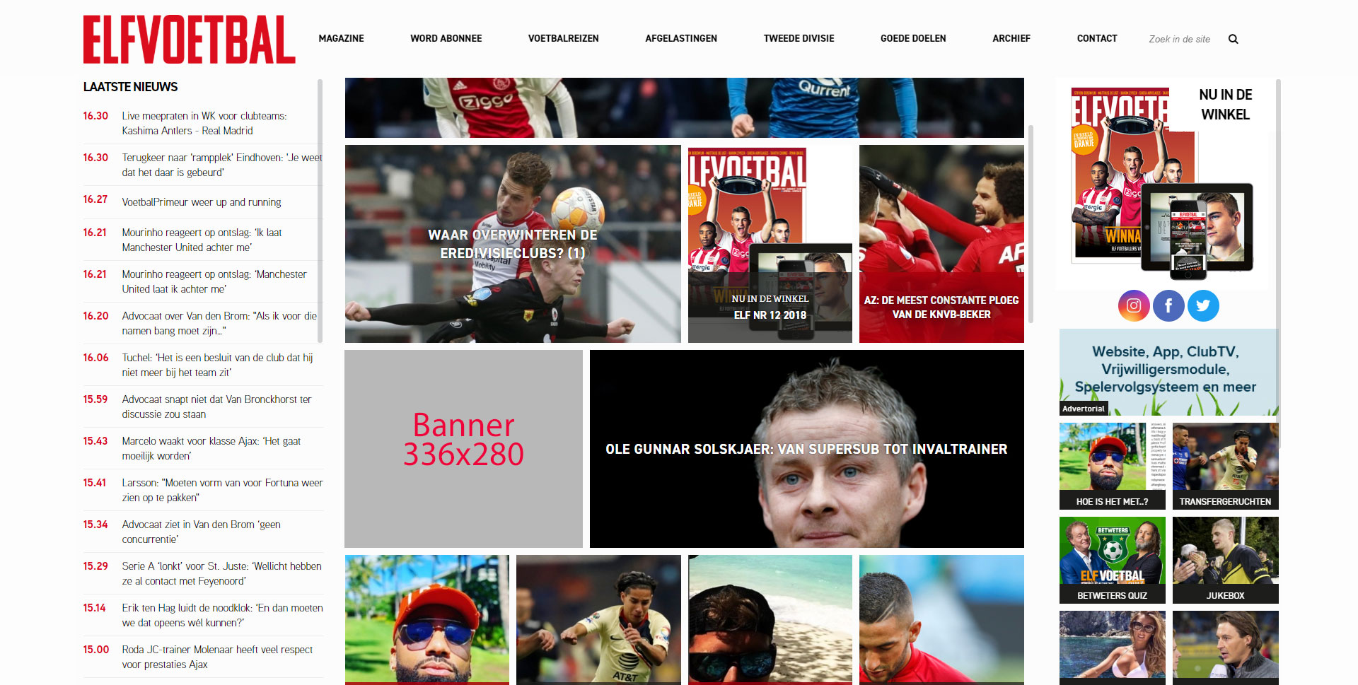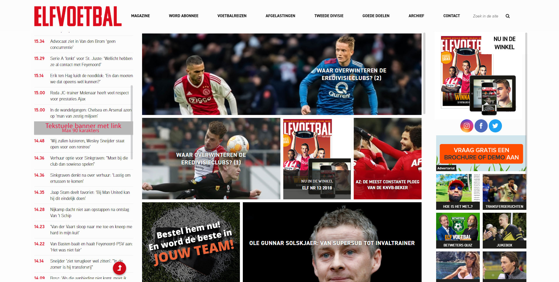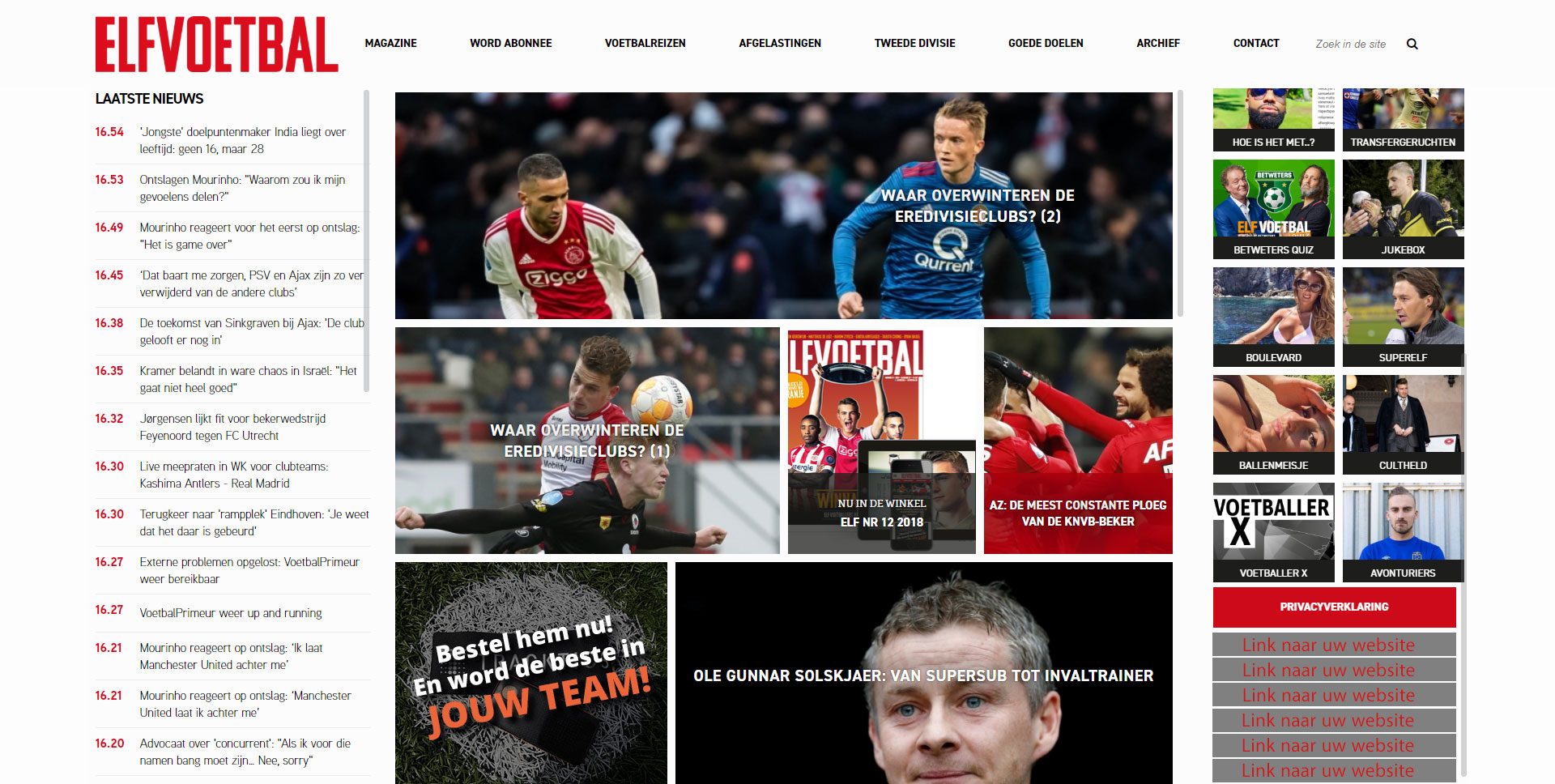 ELFvoetbal.nl is één van de snelst groeiende voetbalsites van ons land. Inmiddels bezoeken maandelijks vele honderdduizenden bezoekers de website om geïnformeerd te worden over het laatste nieuws en onze unieke eigen achtergrondverhalen. De hoge bezoekersloyaliteit van de site wordt versterkt door de combinatie de verspreiding van de nieuwsbrief en uiteraard het magazine in print en digitale vorm..