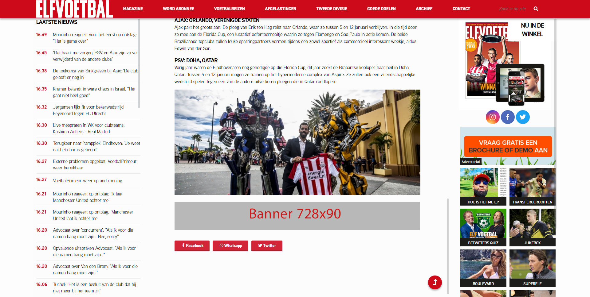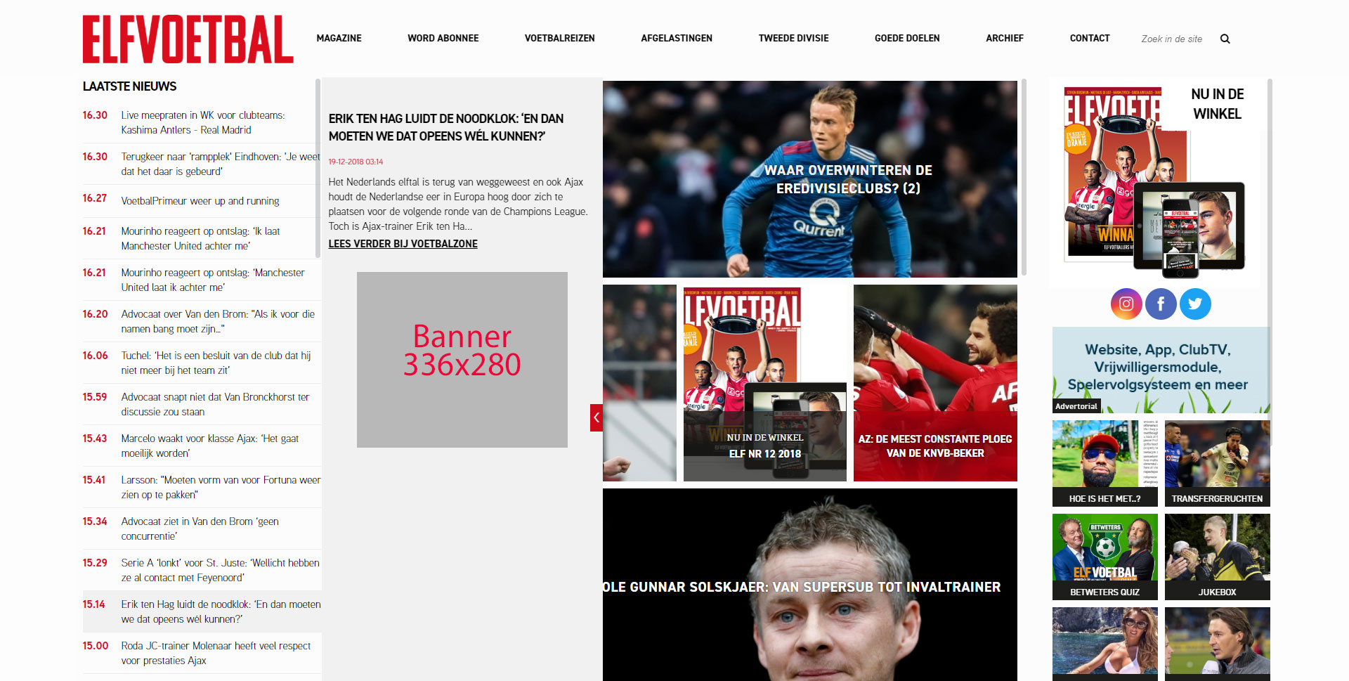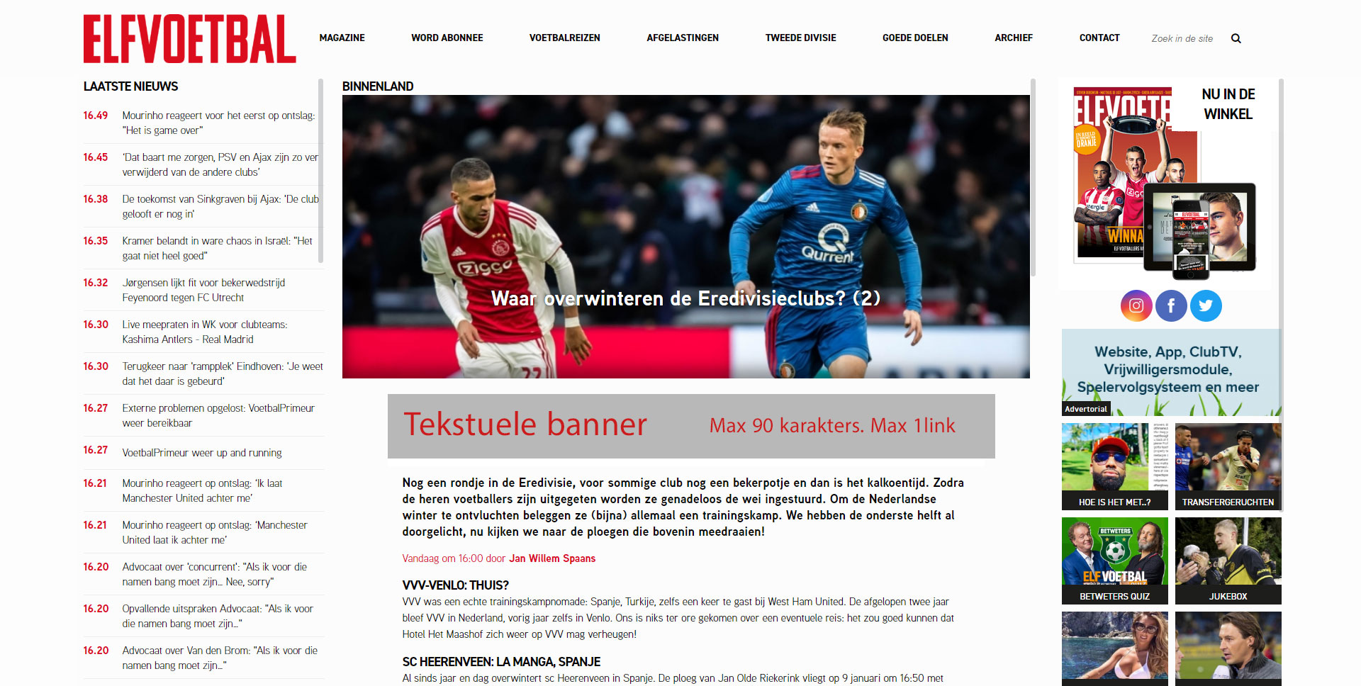 ELFvoetbal.nl is één van de snelst groeiende voetbalsites van ons land. Inmiddels bezoeken maandelijks vele honderdduizenden bezoekers de website om geïnformeerd te worden over het laatste nieuws en onze unieke eigen achtergrondverhalen. De hoge bezoekersloyaliteit van de site wordt versterkt door de combinatie de verspreiding van de nieuwsbrief en uiteraard het magazine in print en digitale vorm..