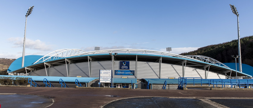 ‘We Are Proud’, ‘We Never Give In’, ‘We Have No Limits’ en ‘We Believe’. In de hele stad wemelt het van de kreten op banners met het logo van Huddersfield Town. Ontelbaar veel lantaarnpalen zijn versierd met een blauw-wit dundoek. Ook op alle invalswegen kan geen bezoeker om de aanwezigheid van de voetbaltrots heen. ‘Welcome In The Home Of The Terriers’ is te lezen op de trappen van het treinstation. Een immense leeuw op een dak tegenover het station draagt een sjaal van Huddersfield Town. Dat de voetbalclub de stad trots maakt, valt op geen enkele manier te ontkennen.