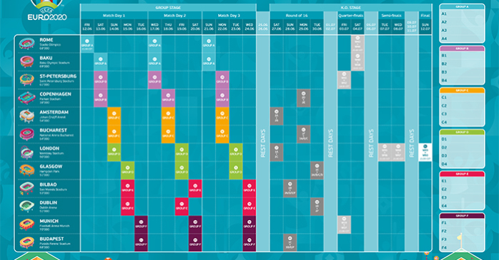 Het EK 2020 begint op 12 juni. De finale staat ingeroosterd voor zondag 12 juli. Na ekle ronde zijn er telkens twee rustdagen. Tussen de halve finale en finale zitten zelfs drie voetballoze dagen. De tijdstippen van de groepswedstrijden moeten nog worden geprikt. De kwartfinales beginnen om 18.00 uur en 21.00 uur. De halve finale en de eindstrijd om 21.00 uur.