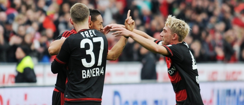 Frey na een doelpunt bij Leverkusen