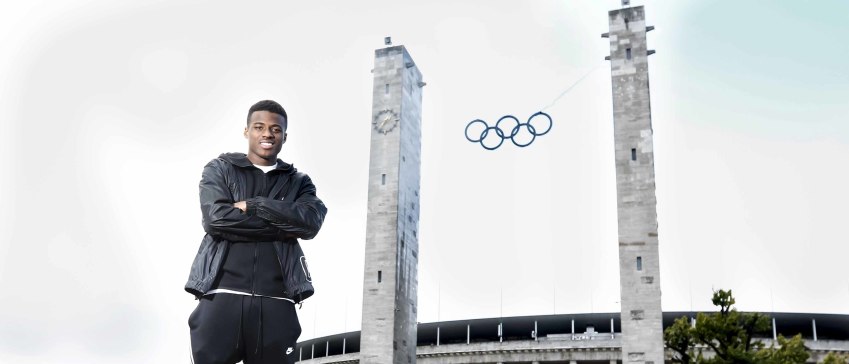 82 jaar na die omstreden Spelen, waarbij Hitlers propagandamachine op volle toeren draaide, ligt het Olympiastadion in het Westen van Berlijn er nog grotendeels hetzelfde bij. Alleen de rode vlaggen met swastika's ontbreken. “Zie je die gebouwen daar?”, zegt Dilrosun en wijst naar een batterij bouwwerken van rode baksteen. “Die komen ook voor in de film. Daarin huist nu ons trainingscomplex. Grappig hè?”