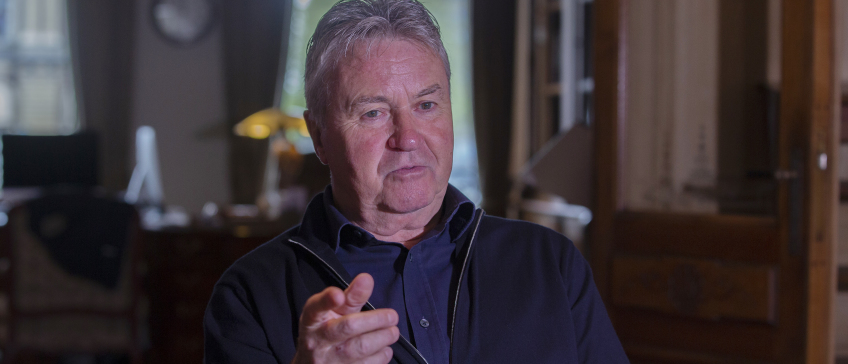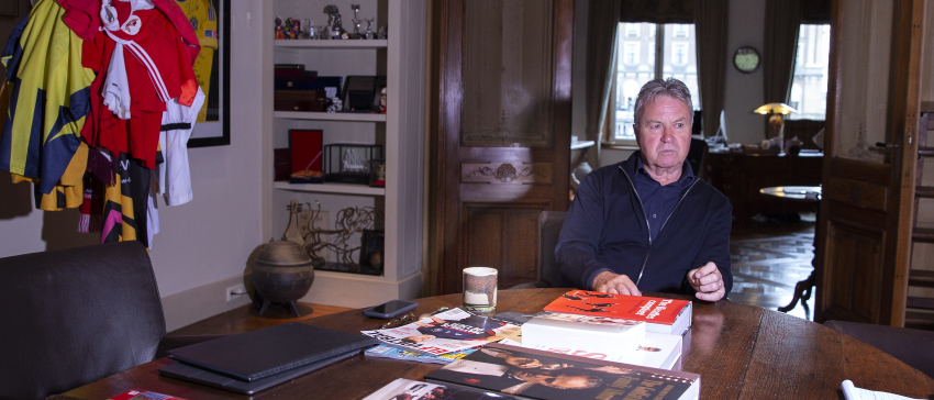 Op de grote televisie in de werkruimte van Hiddinks woning in hartje Amsterdam wordt net een balletje afgeslagen. “Ik zet hem wel even uit, kunnen we rustig gaan zitten”, zegt hij, waarna het beeldscherm automatisch in een kast verdwijnt. Ingelijste shirts van PSV en Chelsea compleet met handtekeningen, kampioensschalen, bekers en schilderijen dienen als aankleding. “Alles lag links en rechts door elkaar. Mijn partner (Liesbeth, red.) zei al herhaaldelijk dat zonde te vinden. Ze heeft alles een mooi plekje gegeven. Dat doet me goed.” Alleen de vele voetbalshirts hangen nog over elkaar op een kapstok. “Die moet ik nog ordenen. Ik ben geen verzamelaar. Tijdens mijn loopbaan heb ik zelden om een shirtje gevraagd. Dat doen spelers onderling. Toch heb ik er veel.”