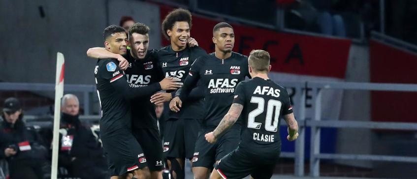 Spelers van AZ vieren een doelpunt in de met 0-2 gewonnen uitwedstrijd tegen Ajax