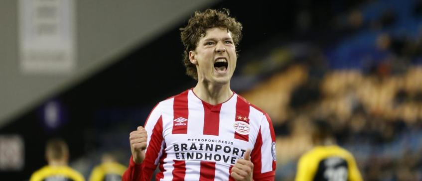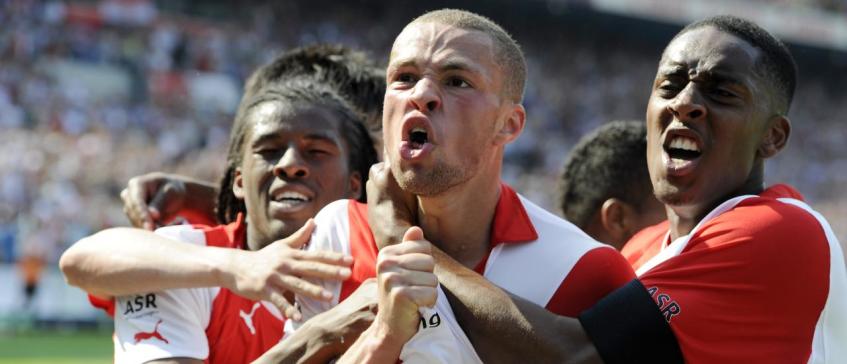 Luc Castaignos viert zijn treffer tegen PSV in 2011, links Georginio Wijnaldum, rechts Leroy Fer