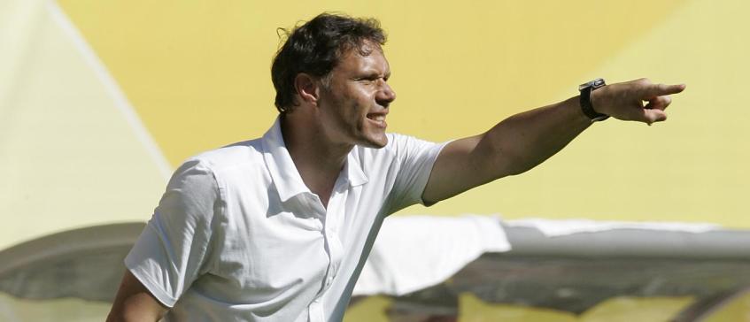 Marco van Basten geeft aanwijzingen aan het Nederlands elftal in het duel met Servië en Montenegro tijdens het WK 2006