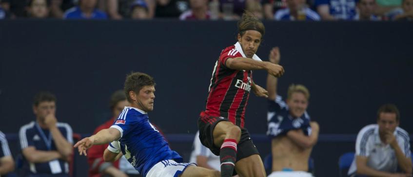 Klaas-Jan Huntelaar namens Schalke 04 in actie tegen zijn oude club AC Milan