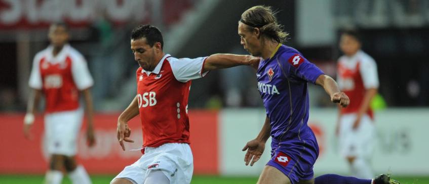 Mounir El Hamdoui houdt namens AZ Per Krøldrup van Fiorentina van de bal