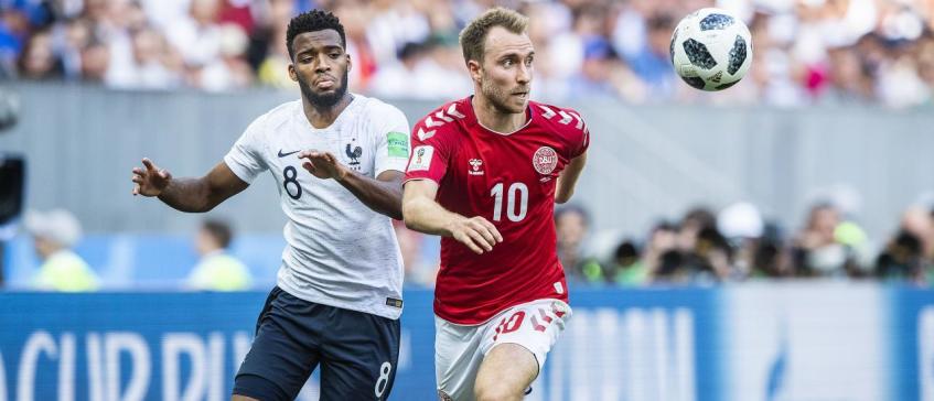 Thomas Lemar kijkt toe hoe Christian Eriksen namens Denemarken de bal heeft