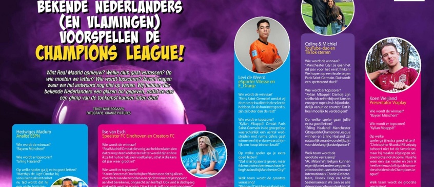 We maakten een overzicht van de tien grootste talenten die dit seizoen gaan shinen in de Champions League. Een overzicht van alle (!) stadions waar de wedstrijden worden gespeeld. Daarbij natuurlijk ook het finalestadion in Istanbul. Hoeveel mensen kunnen een plekje vinden? Hoe ziet het eruit? En waar in Europa ligt het? In de PANNA! Awards stemden jullie voor het mooiste Champions League-uitshirt van Ajax, we vroegen zes bekende Nederlanders naar hun voorspellingen over het komende Champions League-seizoen. En zelfs twee bekende Belgische TikTokkers! En natuurlijk vind je een leuke fotostrip, de grappigste voetbalmoppen en vele weetjes over het belangrijkste clubtoernooi van de wereld.