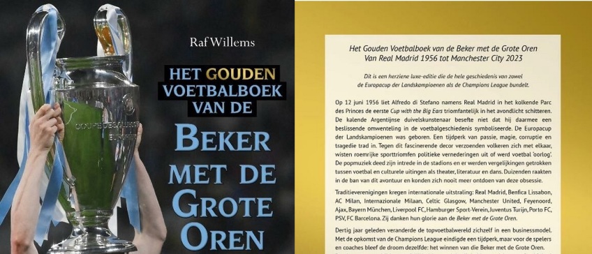 ‘Het Gouden voetbalboek van de Beker met de Grote Oren. Van Real Madrid 1956 tot Manchester City 2023’ wordt uitgegeven door Willems Uitgevers en is bij alle reguliere boekhandels te koop óf te bestellen via https://boeken.cafe/boek/het-gouden-boek-van-de-beker-met-de-grote-oren-1956-1992-raf-willems/