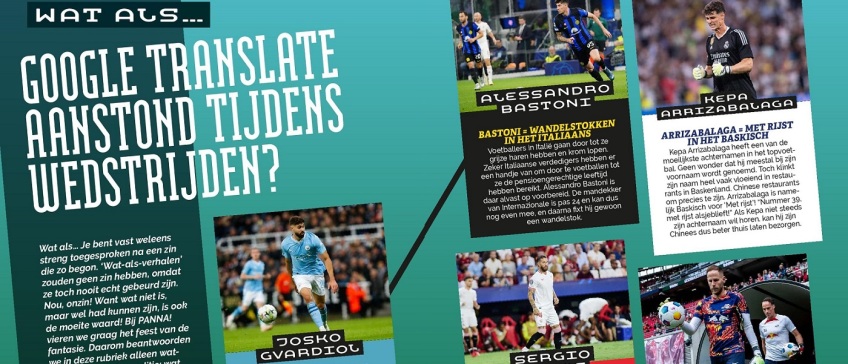 Wat als... Bij PANNA! vieren we graag het feest van de fantasie. Deze keer: wat als... Google Translate aanstond tijdens wedstrijden? Sommige spelers zouden een aparte naam op hun rug hebben! Op televisie kijk jij namelijk naar wandelstokken, rijst, goulash en een wolk. In een andere taal komen de namen overeen met die van bekende spelers. In het artikel lees je welke.
