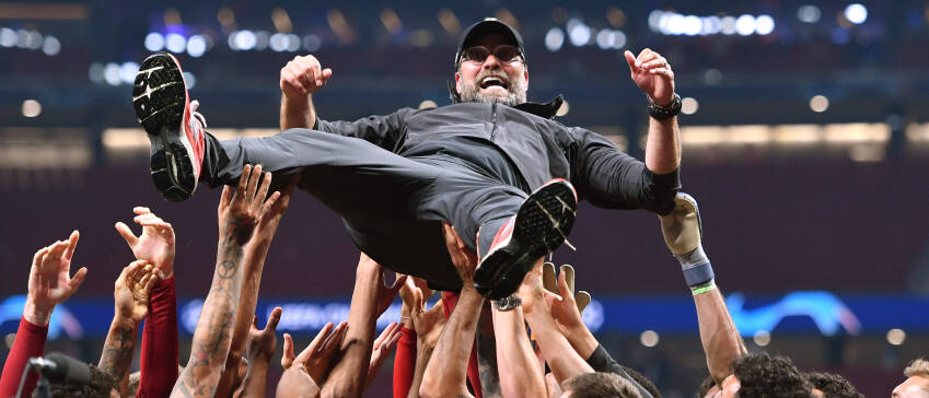Klopp wordt na de gewonnen Champions League-finale vreugdig op en neer gegooid door de selectie.