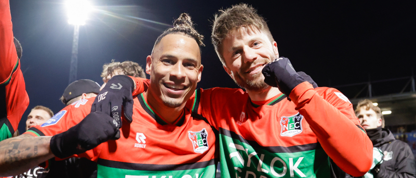 Tjaronn Chery viert het bereiken van de KNVB bekerfinale met Lasse Schöne.