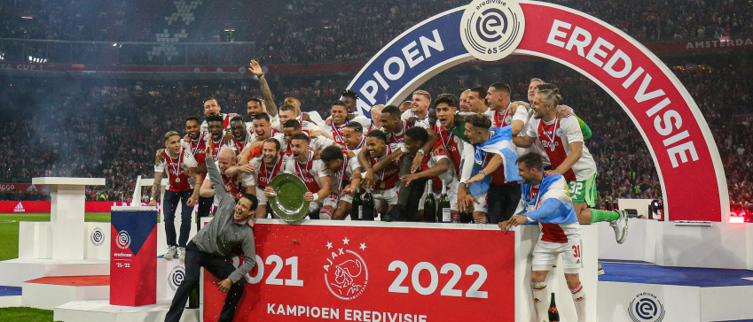 Jari Litmanen (op de voorgrond) en de selectie van Ajax vieren het 36ste landskampioenschap.
