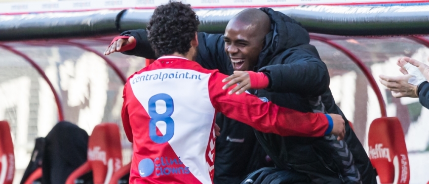 Yassin Ayoub deelt een knuffel uit aan reservespeler Edson Braafheid.