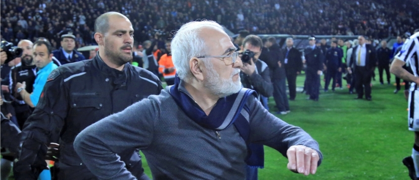 bekogeld werd. PAOK verloor de wedstrijd reglementair met 3-0, kreeg daar nog eens drie punten in mindering bovenop en moest een paar wedstrijden zonder publiek spelen. Maar de druppel kwam op zondag 11 maart. PAOK leek te scoren tegen AEK, maar de goal werd voor buitenspel afgekeurd. Daarop bestormde PAOK-eigenaar Ivan Savvidis gewapend het veld.”