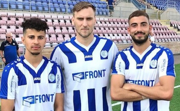 Memisoglu (rechts) samen met twee teamgenoten van Eskilstuna City.
