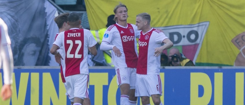 Ajax was in een intensieve strijd verwikkeld met PSV, toen het eind februari op bezoek ging bij ADO Den Haag. Puntenverlies in de Hofstad kon daarom dodelijk zijn, zeker omdat de concurrent vrijwel nooit verloor. In dat kader kreeg Ajax in de 37e minuut een grote domper te verwerken met de (prachtige) tegentreffer van Nasser El Khayati. Maar daarna was Ajax wakker. Meteen erna maakte Donny van de Beek gelijk en kort voor de pauze zette Dusan Tadic de Amsterdammers op voorsprong. Na de pauze was het verzet van ADO Den Haag gebroken en liep Ajax via Hakim Ziyech (2x) en Kasper Dolberg uit naar een ruime 1-5 overwinning. Later die middag kwam er meer goed nieuws, want PSV had punten verspeeld tegen Feyenoord.