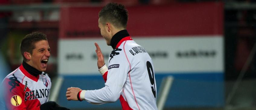 Dries Mertens en Ricky van Wolfswinkel vieren een doelpunt tegen Napoli. Waar Mertens nu topschutter aller tijden is.