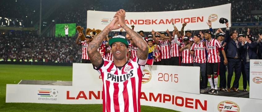Wijnaldum viert de gewonnen landstitel met PSV in 2015