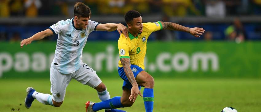 Nicolás Tagliafico in duel met Gabriel Jesus van Brazilië in de halve finale van de Copa América.