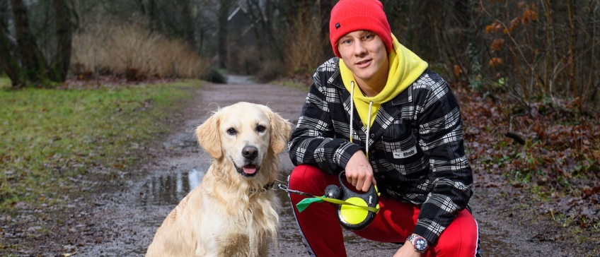Sociaal, gehoorzaam, intelligent en leergierig: het zijn de eigenschappen van golden retriever Messi, maar ook die van zijn baasje Jesse Bosch (21). De middenvelder wil een ‘volwaardige Eredivisie-speler’ worden, vertelde hij tijdens een bijzonder natte uitlaatronde in De Lutte. Het liefst bij FC Twente. "Als supporter keek ik veel naar Wout Brama. Bijzonder dat ik nu samen met hem op het middenveld sta. Dat had ik toen niet durven dromen. Wout is een voorbeeld van hoe je een mooie carrière kunt opbouwen."