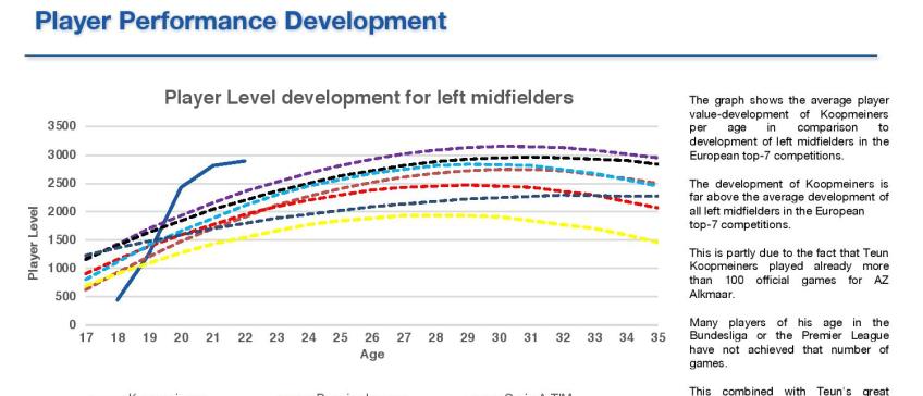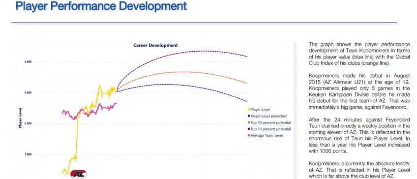 Zo vergeleek het analysebureau uit Amsterdam vorig jaar de waardeontwikkeling van Koopmeiners met andere spelers van zijn leeftijd in de zeven grootste competities van Nederland. De aanvoerder van AZ, nog onder contract tot medio 2023, kende destijds een waarde van 2.928. Na een nieuwe analyse dit jaar bleek deze gestegen te zijn naar een waarde van 3.017. Wat betekent dat hij op dat vlak ver boven de gemiddelde ontwikkeling van linkermiddenvelders in de Europese topcompetities uitsteekt. Zo ligt dat van een speler uit de Premier League op 22-jarige leeftijd op 2.500 punten. De overige competities scoren nog lager, met Portugal met 1.500 punten als hekkensluiter.