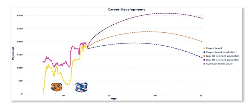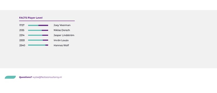 Om te beginnen heeft FACTS gekeken naar de persoonlijk ontwikkeling van Joey Veerman. In de onderstaande grafiek is terug te zien dat Veerman op hetzelfde niveau zit als het gemiddelde team niveau van sc Heerenveen. Het gemiddelde teamniveau van Hellas Verona en de Rangers ligt een stuk hoger dan dat van Heerenveen. Dit hogere teamniveau zorgt er wel voor dat Veerman in een omgeving terecht komt waarin hij voldoende ruimte heeft om verder te groeien bij een eventuele transfer.