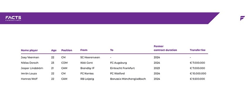 De tabel hierboven laat zien dat de laagste transfersom zeven miljoen euro was en de hoogste tien miljoen euro. Deze spelers zijn echter wel wat beter dan Veerman als we kijken naar de Player Levels. Niklas Dorsch met een Player Level van 2135 heeft 408 punten meer dan Joey Veerman. Dit is een significant verschil in Player Level en deze zomer maakte Dorsch de overstap van KAA Gent naar FC Augsburg voor zeven miljoen euro.