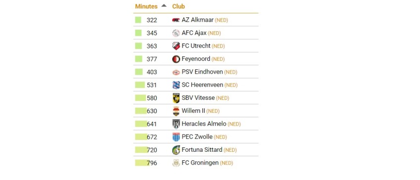 Vanaf 2018/2019 waren de meeste strafschoppen per minuut voor AZ. De Alkmaarders kregen eens in de 322 minuten een strafschop mee in de Eredivisie. Ook Ajax kreeg veel strafschoppen mee. De Amsterdammers staan op een strafschop per 345 minuten in de Eredivisie. De top drie wordt compleet gemaakt door FC Utrecht. De Domstedelingen kregen van de scheidsrechter een strafschop per 364 speelminuten.