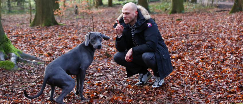 Dat laatste hoort bij het ras. Weimaraners werden oorspronkelijk gefokt voor het opsporen van groot wild, zoals beren, en als jachthond. “Dat wisten we. We proberen het af te leren. Gelukkig hadden zijn ouders al nauwelijks een jachtinstinct meer. Alle puppy’s uit het nest van zijn moeder werden meegenomen naar een jacht. Er werd onder meer geschoten om de reactie van de honden te zien. Zijn moeder was angstig. Kroop ineen. Daardoor heeft Cooper die eigenschap ook minder sterk dan andere honden van hetzelfde ras.”