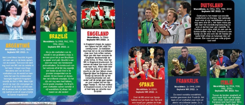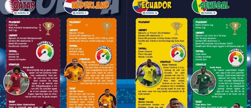 Tel maar mee! Er zijn dit jaar 32 deelnemers op het WK. Verdeeld over acht poules. We hebben ze allemaal voor je op een rij gezet. Wie is de sterspeler? Wie het talent? Kijk snel en vind nog meer leuke informatie over elk land. Weet je bijvoorbeeld welk Afrikaans land de meest waardevolle selectie heeft? Wat de bijnaam is van Wales? En wat kan Robert Lewandowski tijdens dit WK goedmaken? Lees alles op 32 pagina's!