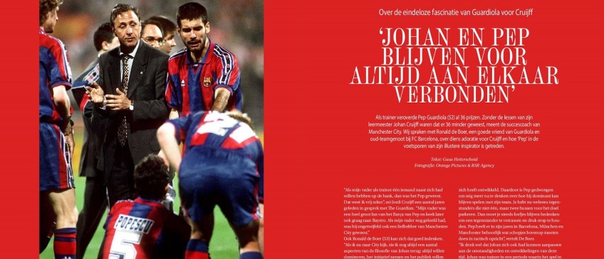 Het Nederlands voetbal is meer dan het spel van Nederlandse teams. Het is een concept. Een filosofie. En die filosofie is nog springlevend. Succesvol ook. Zij het niet meer altijd door Nederlandse clubs uitgevoerd. De meest succesvolle club van Europa floreert onder bewind van een trainer die zijn filosofie naar eigen zeggen voor tachtig procent dankt aan een Nederlander. Wij spraken Ronald de Boer over Pep Guardiola’s fascinatie voor Johan Cruijff. "Johan en Pep blijven voor altijd aan elkaar verbonden."