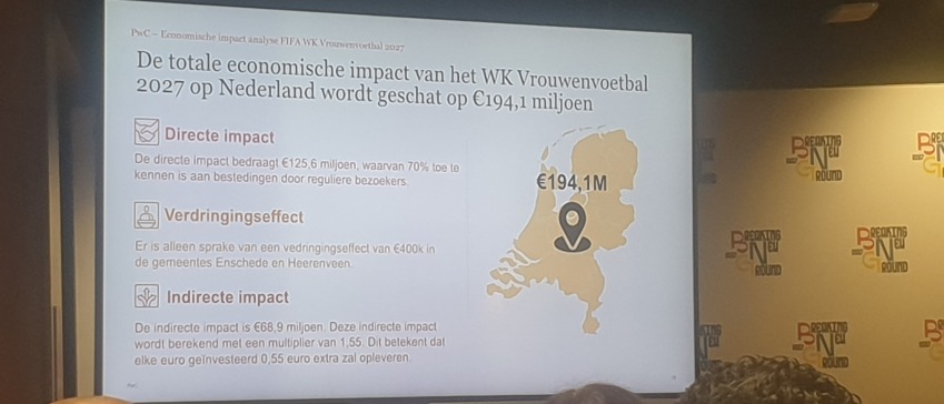 Accountantsbureau PwC berekende op verzoek van de WK 2027-organisatie de economische impact van het toernooi. Volgens partner Jacques de Swart levert het mondiale sportevenement een totaalbedrag van 194,1 miljoen euro op. Een optelsom van de verwachte uitgaven van supporters, media en deelnemende landen. Een directe impact van 125,6 miljoen euro, waarvan zeventig procent is toe te kennen aan bestedingen door reguliere bezoekers. De gemeente Enschede en Heerenveen hebben aangegeven dat 400.000 euro wegvalt vanwege het zogenaamde verdringingseffect. Toeristen die vanwege het WK juist de steden mijden of inwoners die daardoor elders hun geld besteden. De indirecte impact bedraagt 68,9 miljoen euro.