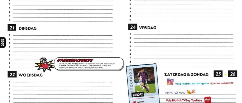 De PANNA! Voetbalagenda 2024-2025 is nu uit! Verkrijgbaar via de bekende kantoorboekhandels en op grote reislocaties als de NS-Stations, Schiphol en Eindhoven Airport. Daarnaast is hij ook online te bestellen. Via deze link. Voor 15 uur besteld, betekent nog diezelfde dag verstuurd. Ook elke editie van PANNA! is los te bestellen. Vind de informatie daarvoor op deze pagina.