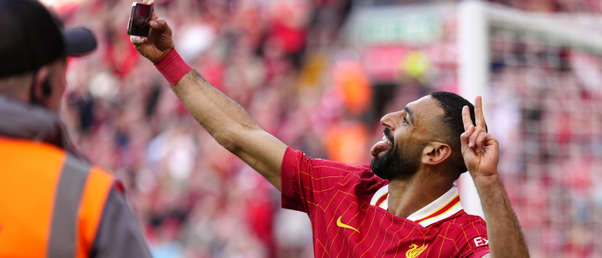 Mohamed Salah maakte zondag een selfie na zijn doelpunt in de kampioenswedstrijd tegen Tottenham Hotspur