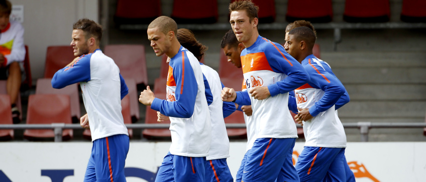 Luc Castaignos en Stefan de Vrij gezamenlijk op een training van Oranje.