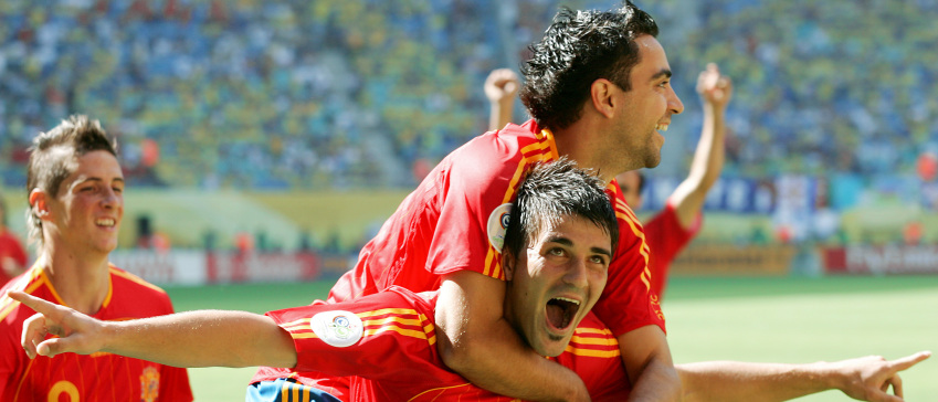 David Silva wordt bejubeld door Xavi na zijn goal tegen Oekraïne in 2006.