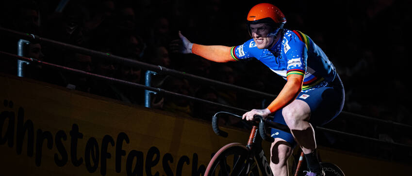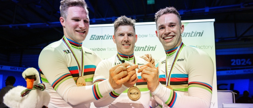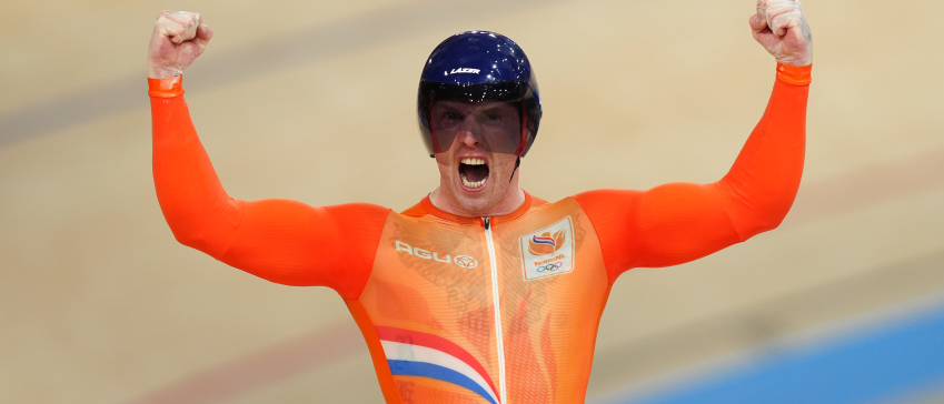 Met zijn gouden maatjes Harrie Lavreysen en Jeffrey Hoogland.