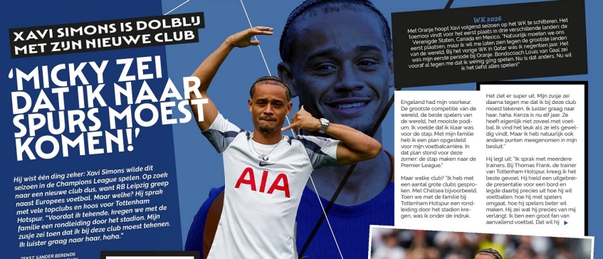 Hij wist één ding zeker: Xavi Simons wilde dit seizoen in de Champions League spelen. Op zoek naar een nieuwe club dus, want RB Leipzig greep naast Europees voetbal. Maar welke? Hij sprak met vele topclubs en koos voor Tottenham Hotspur. "Voordat ik tekende, kregen we met de familie een rondleiding door het stadion. Mijn zusje zei toen dat ik bij deze club moest tekenen. Ik luister graag naar haar, haha."