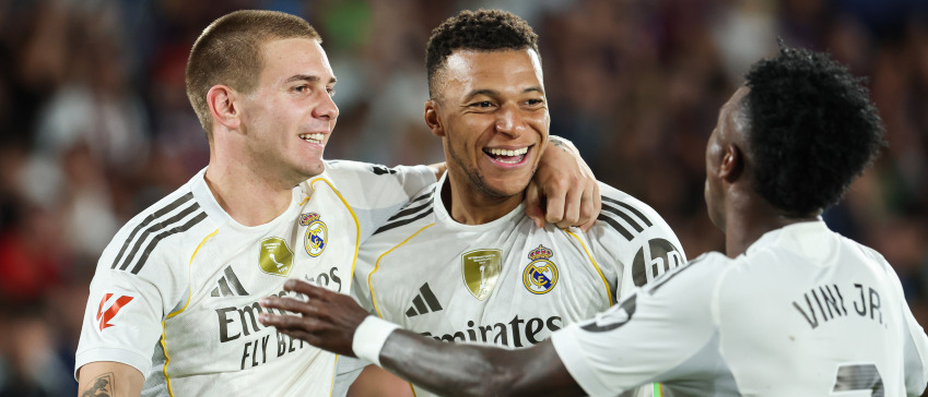 Kylian Mbappé wordt na zijn doelpunt tegen Levante gefeliciteerd door Franco Mastantuono en Vinícius Júnior
