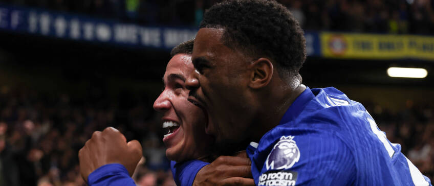 Jorrel Hato en Enzo Fernandez vieren de late goal van teamgenoot Estevao tegen Liverpool.