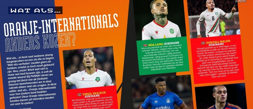 Wat als? Je kent de vraag vast. In PANNA! doen we dat ook enkele keren per jaar. Deze keer: wat als... Oranje-internationals voor hun ándere land hadden gekozen? We zetten achttien spelers op een rij en die zien we op de foto terug in het tenue van 'hun andere land'. Suriname zou het meest blij worden als de Oranje-internationals die andere keuze daadwerkelijk hadden gemaakt.
