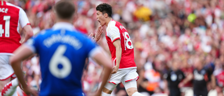 Een euforische Tomiyasu nadat hij net voor Arsenal heeft gescoord tegen Everton.