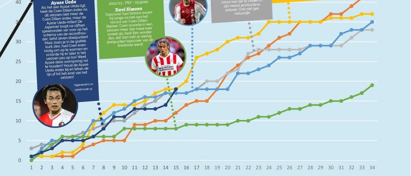 De Coen Dillen-index is een grafiek waarmee topscorers vergeleken worden met de ultieme topscorer van de Eredivisie-geschiedenis: Coen Dillen. In het seizoen 1956/57 maakte deze doelpuntenjager 43 goals! Om te laten zien hoe knap dit is, hebben we een aantal andere topscorers uit de Eredivisie-geschiedenis in de Coen Dillen-index gezet. Onder hen de nieuwste uitdager Ayase Ueda! De spits van Feyenoord is op weg naar een record.