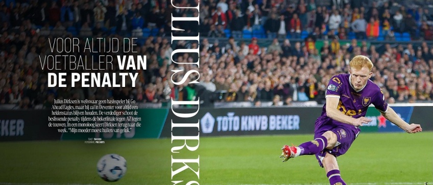 Julius Dirksen is weliswaar geen basisspeler bij Go Ahead Eagles, maar hij zal in Deventer voor altijd een heldenstatus blijven houden. De verdediger schoot de beslissende penalty tijdens de bekerfinale tegen AZ tegen de touwen. In een monoloog keert Dirksen terug naar die week. "Mijn moeder moest huilen van geluk."