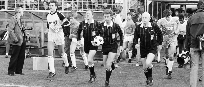 Aanvoerders Frank Brugel (links) en Marco van Basten (rechts) betreden onder aanvoering van scheidsrechter John Blankenstein het veld voor de KNVB Bekerfinale van 1986
