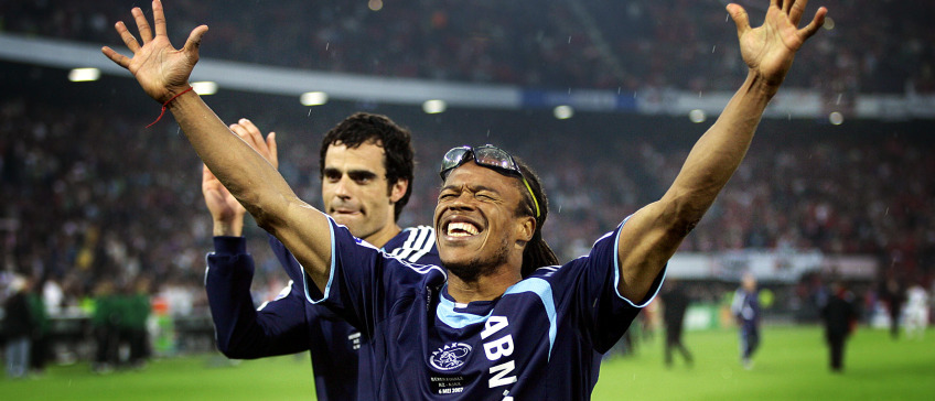 Edgar Davids in uitzinnige vreugde na het winnen van de bekerfinale in 2007; hij maakte de beslissende penalty.