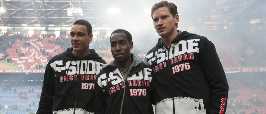 Gregory van der Wiel, Vurnon Anita en Jan Vertonghen worden gehuldigd na hun vertrek uit Amsterdam.